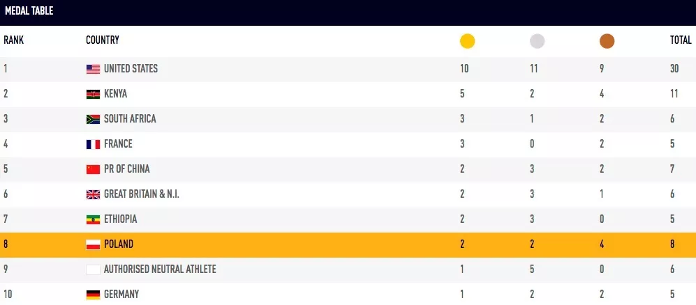 W klasyfikacji medalowej mistrzostw, z dorobkiem 2 złotych, 2 srebrnych i 4 brązowych krążków - Polska uplasowała się na wysokiej ósmej pozycji. Wśród reprezentacji europejskich lepsi byli tylko Brytyjczycy i Francuzi. Brawo!