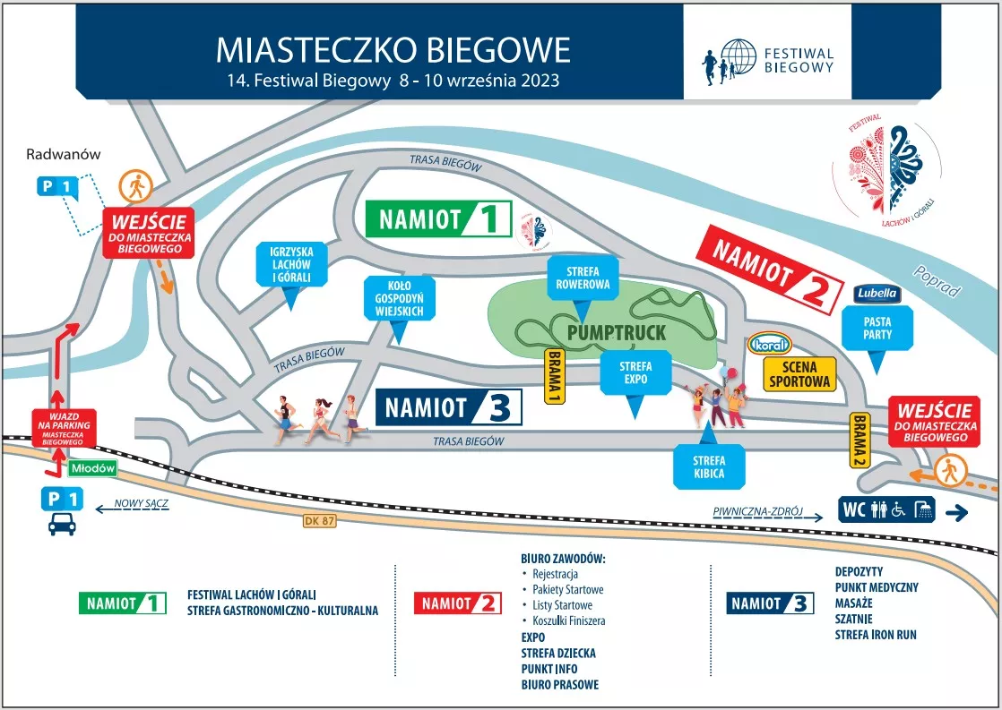 Gdzie będzie się mieściło biuro zawodów, a gdzie strefa Iron Run, gdzie parkingi, rejestracja, punkt medyczny, punkt wydawania pakietów startowych i koszulek finiszera? Wszystko już rozplanowane na mapce Miasteczka Biegowego na Nakle w Piwnicznej-Zdroju, które od 8 do 10 września znów gościć będzie uczestników Festiwalu Biegowego.