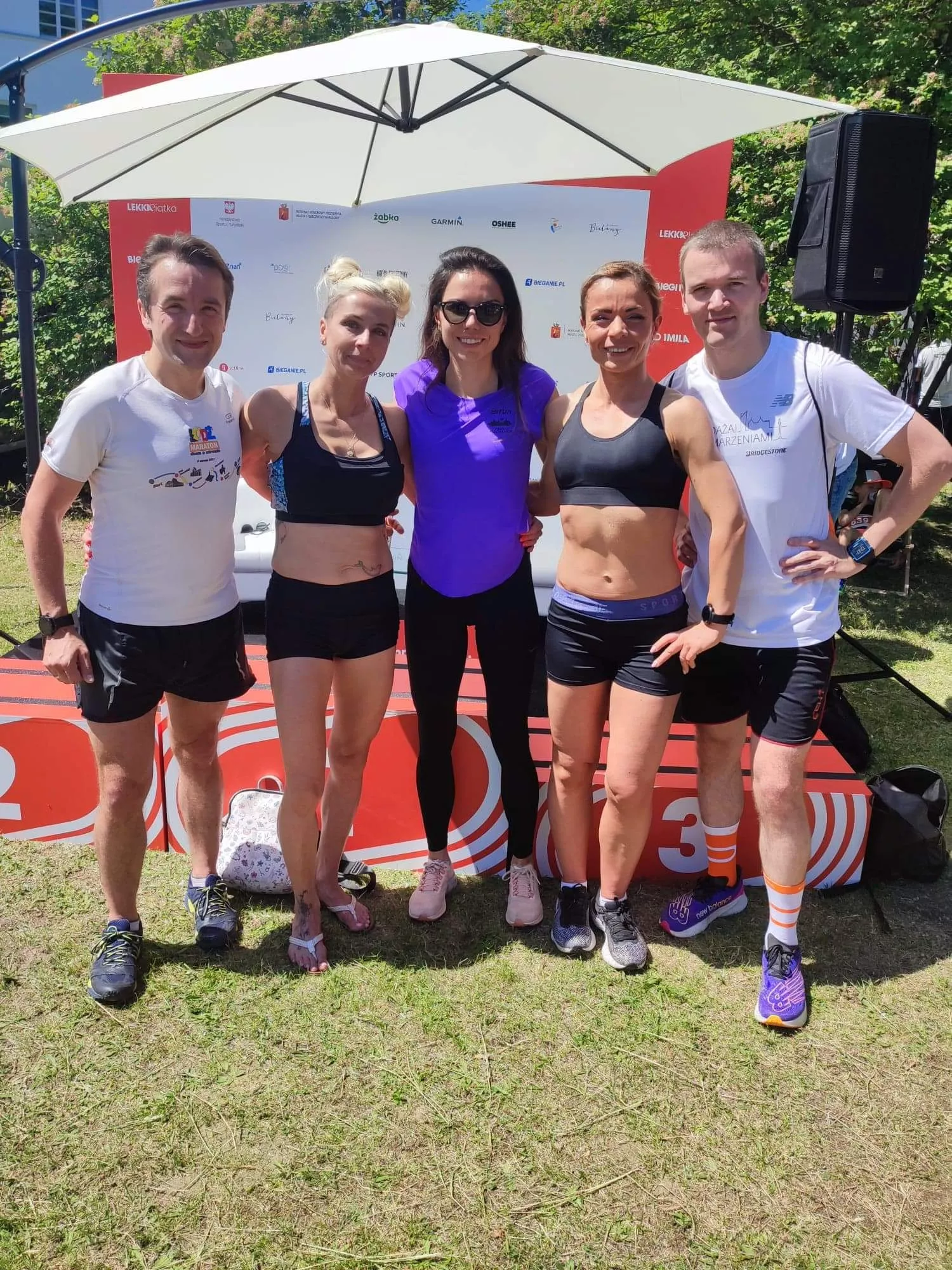 Godzina 9. Start 5 km. Poszły konie po betonie, tzn po tartanie, asfalcie, alejkach wokół stadionu. Dość szybko utworzyła się grupka i tak się trzymaliśmy.