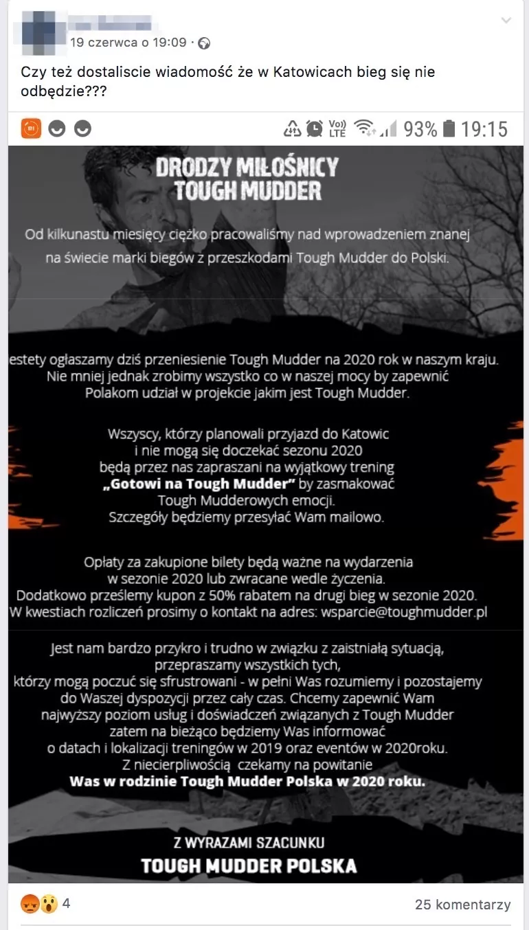 Na facebookowym profilu Tough Mudder Polska pojawił się komunikat o przeniesieniu imprez na 2020 r.