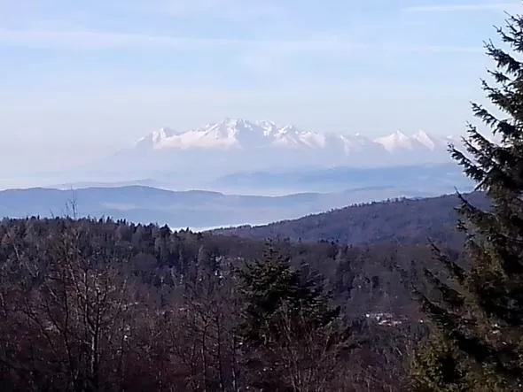 Tuż przed końcowym „atakiem” – mam nadzieję, że nie serca – napotykamy czerwony szlak i, przecinając go, pniemy się niemal na czworakach na sam szczyt. Przy bezchmurnej słonecznej pogodzie, nagrodą za osiagnięty trud 9,5 km człapania pod górę, będzie widok na pasmo Tatr po prawej, zaś z lewej strony, pod pierzynką opadających porannych mgieł, zobaczymy okoliczne doliny. Warto zrobić kilka zdjęć!