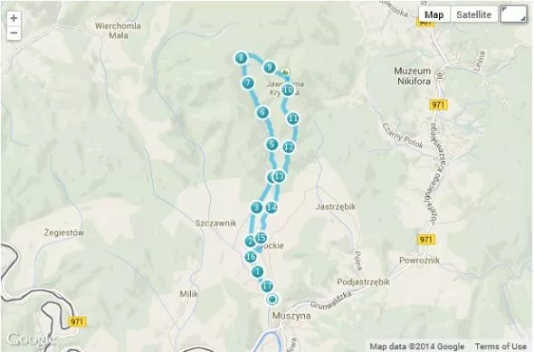Trasa rozpoczyna się przy ul. Zazamcze w Muszynie, gdzie razem biegną szlaki zielony z żółtym. Lekko pod górę kierujemy się w stronę Złockiego i biegniemy około 1,5 km, gdzie napotykamy skręt w prawo na zielony szlak i dwie tablice z informacją, że jesteśmy na drodze do cerkwi w Złockiem. Dodatkowym punktem rozpoznawczym zmiany naszego kierunku biegu jest ponad dwumetrowy betonowy dzban – jeden z kilku charakterystycznych w Muszynie elementów kultury beskidzkiej.