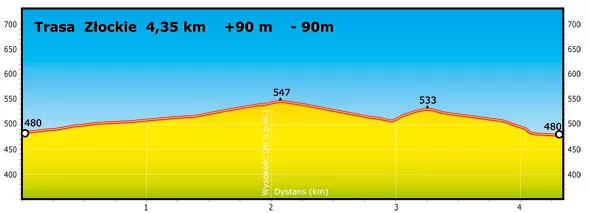 Start i meta przy Hotelu Klimek. Trasa biegnie zielonym szlakiem do Cerkwi w Złockiem, po czym skręca w lewo w dół drogą asfaltową, gdzie przy szkole skręca w prawo i prowadzi lekko w górę wąską drogą, aż do ujęcia wody. Następnie trasa zakręca w lewo i wraca w dół do Hotelu Klimek.