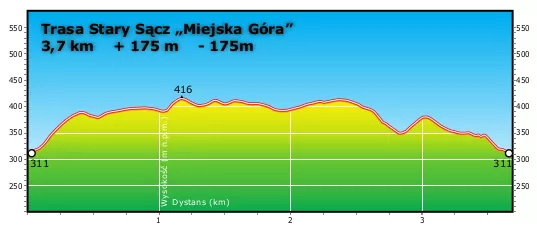 Trasa zaczyna się na ul. Piłsudskiego, na wylocie "betonówki". Na początku biegniemy „betonówką” dość ostro pod górę, z łukiem w lewo. Mijamy leśniczówkę ogrodzoną siatką, następnie z lewej strony pierwsze rondo na Górze Miejskiej. Po około 0,6 km od startu, leśna droga główna odbija w prawą stronę. Trzymamy się tej drogi, aż do polany odległej od zakrętu o około 1,4 km (to jest 2 km od punktu startu). Na polanie trasa zawraca, nie prowadzi jednak drogą, którą się przybiegło, lecz równoległą z prawej strony dotychczasowej trasy. Wracamy do linii mety, do ul. Piłsudskiego (z polany jest to ok. 1,8 km).