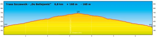 Start i meta trasy znajduję się na parkingu przy wyciągu narciarskim, trasa biegnie do góry szeroką leśną drogą. Podbieg jest bardzo delikatny biegniemy cały czas blisko potoku Szczawniczek, który zapewnia ciekawe widoki i miły chłód w upalne letnie dni. Po dobiegnięciu do "Betlejemki" (altanka, w której zmęczony biegacz może sobie odpocząć) - tu zawracamy i ok. 3 km wracamy w dół do mety tą sama trasą.