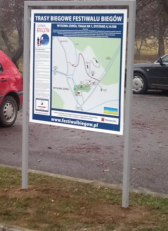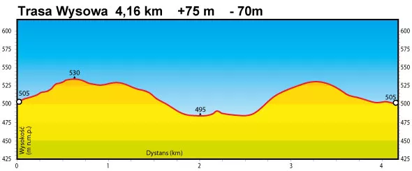 Trasa bierze swój początek obok parkingu przy Rozlewni Wód Mineralnych "WYSOWIANKA", a następnie tuz za mostem na potoku Szumniak uchodzi w głąb parku zdrojowego gdzie przy drugiej kładce pieszej przekracza potok i prowadzi do drogi asfaltowej. Dalej do skrzyżowania, na którym kieruje się w stronę sanatoriów gdzie zaczyna opadać ku rzece Ropie i zawraca. Po ok. 1,3km na wysokości Instytutu Zdrowia Człowieka ponownie uchodzi do parku kończąc sie zbiegiem do parkingu.