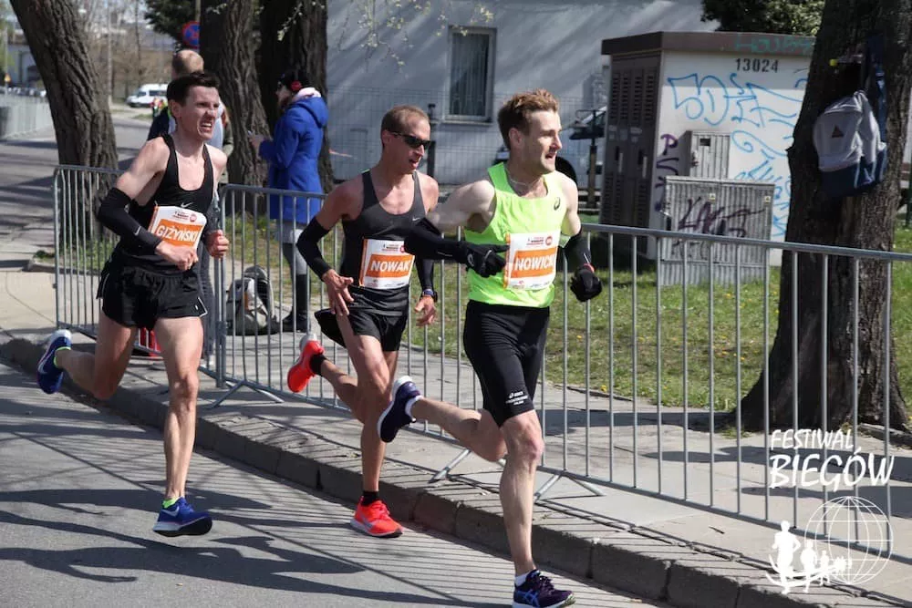 Ponieważ druga część trasy miała być nieco trudniejsza, zakładaliśmy pierwszą „połówkę” w 1:06:15 - a było 1:06:10! Wszystko szło po mojej myśli. Po 20 kilometrze z poprzedzającej nas grupy z Marcinem Chabowskim i Arkiem Gardzielewskim zaczęli odpadać zawodnicy, którzy następnie dołączyli do nas: w pewnym momencie biegliśmy w ośmiu-dziesięciu. Dopiero po podbiegu na Tamce ok. 32 km zostało nas 3 Polaków (Nowicki, Giżyński i Jakub Nowak - red.) oraz Kenijczyk Cosmas Kyeva. Choć trasa była tu trudna, bo dość mocno wiało, czułem, że będę miał jeszcze siły zafiniszować. Zaatakowałem na 41 kilometrze, poszedł ze mną Mariusz, natomiast Kuba nieco został. Tasowaliśmy się, ale w końcu górę wzięło doświadczenie „Giży”, skończył 3 sekundy przede mną. Mimo że przegrałem srebrny medal na ostatnich metrach, cieszę się z tego, co osiągnąłem: dobrą "życiówkę” i medal Mistrzostw Polski w zaledwie drugim maratonie.