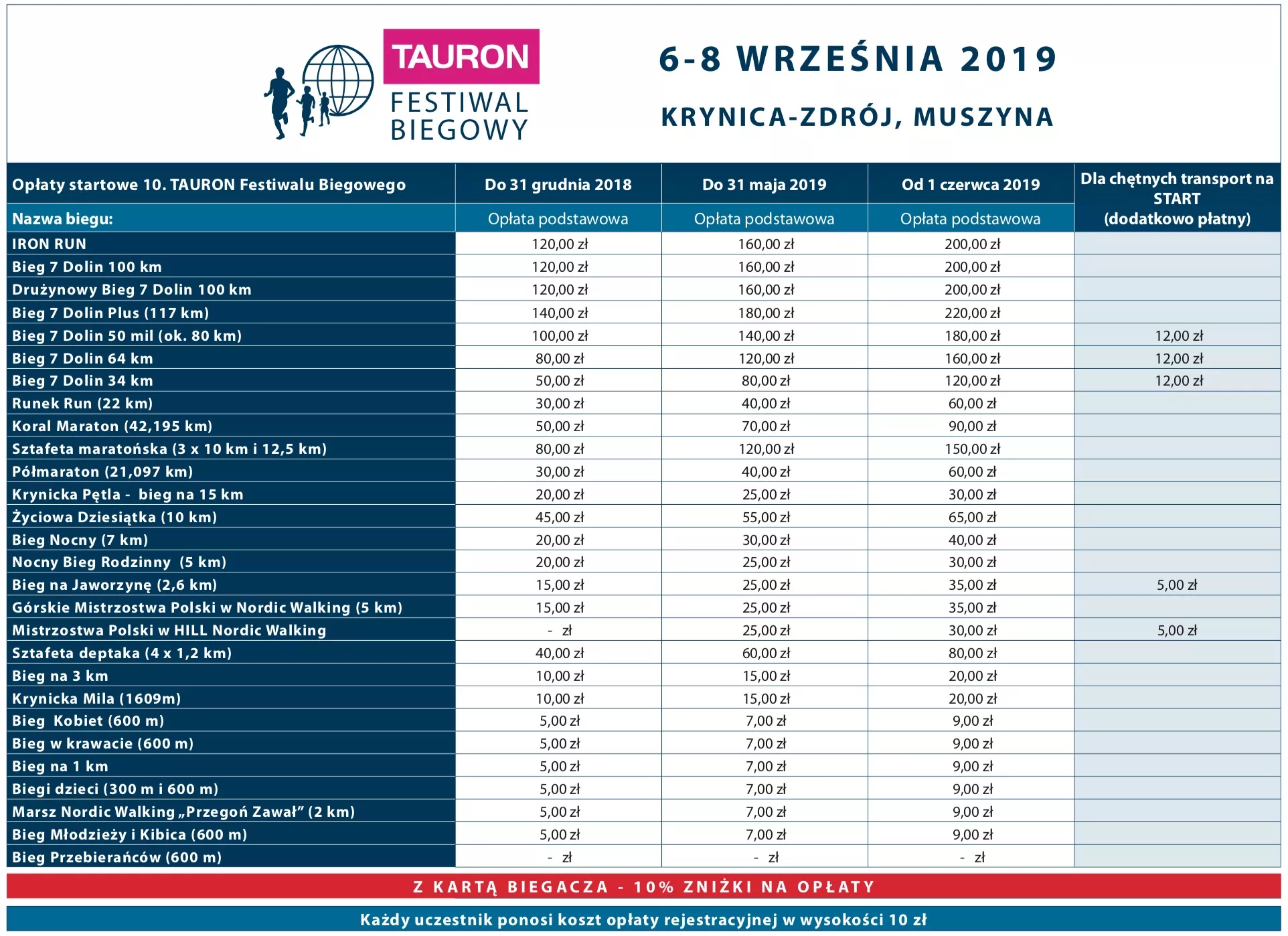 Do końca miesiąca możecie się zapisywać na 10. TAURON Festiwal Biegowy z promocyjnymi opłatami startowymi. Warto zapamiętać tę datę i jeśli planujecie start we wrześniu w Krynicy, dokonać zgłoszenia i wnieść opłatę startową już teraz! TANIEJ JUŻ NIE BĘDZIE!