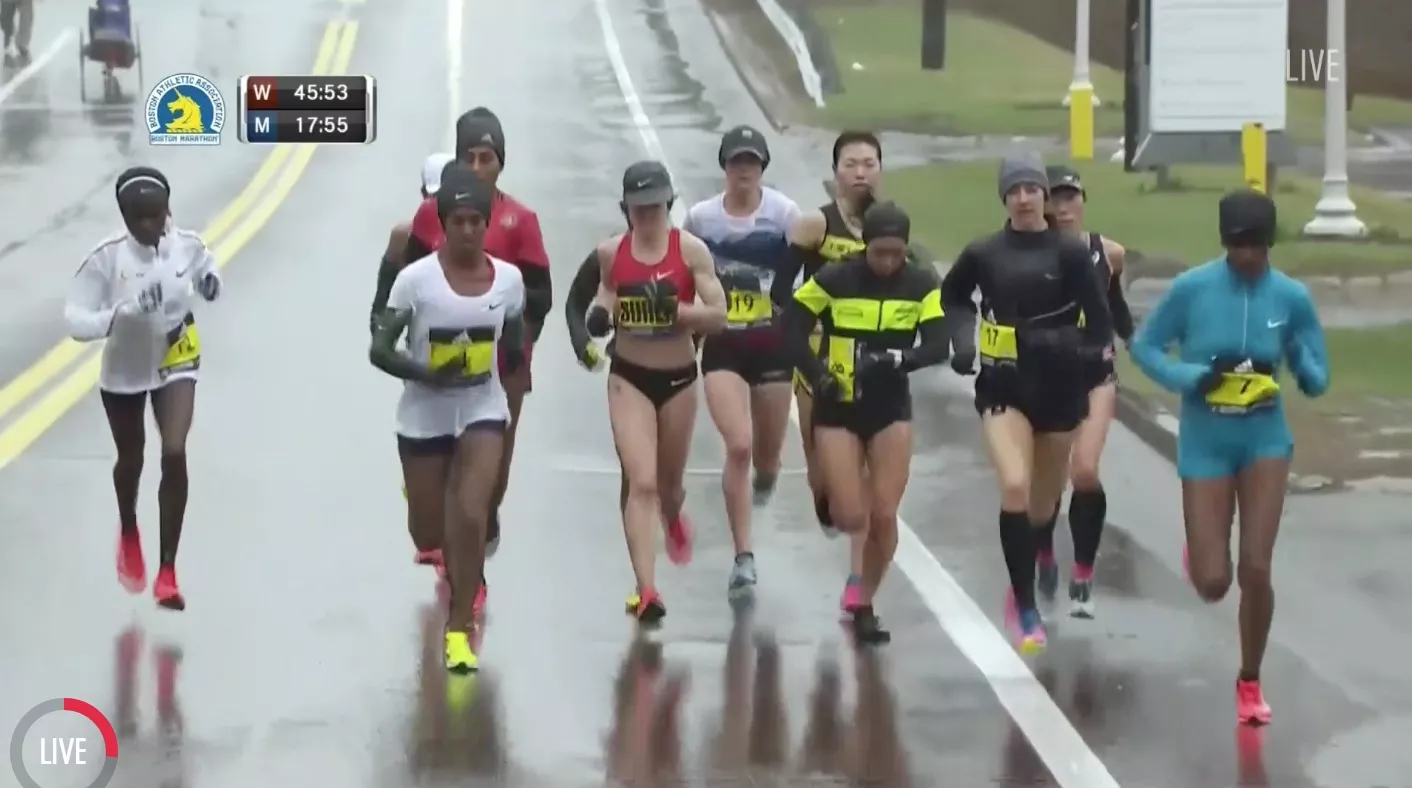 Jako pierwsze na trasę legendarną, pofałdowaną, a przy tym pozbawioną oficjalnego atestu, ruszyły panie. Długo podążały w zawartej grupie. Wśród nich była broniąca tytułu zwyciężczyni z 2017 roku Kenijka Edna Kiplagat oraz zwyciężczyni Maratonu Nowojorskiego Amerykanka Shalene Flanagan. Pierwsze 10 km panie pokonały w 37:07, co prognozowało wynik na mecie w granicach 2:36:00.