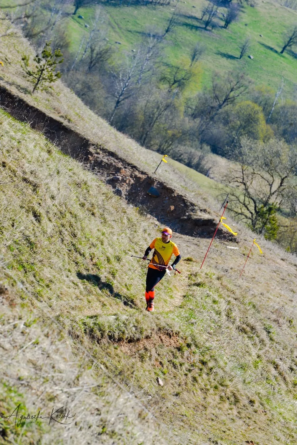 – Już pierwszy podbieg daje 60 m przewyższenia i jest baaaardzo stromy. Achillesy dostają porządnie w... ścięgna. Dalej łagodny dosyć zbieg, powiedzmy że równy (jak na Jesionową), widać zarys ścieżki, więc można się rozpędzić. Nawrotka w prawo na trawie i z powrotem na górę. Drugi podbieg jest na początku łagodny, ale pod koniec wchodzi w las, gdzie ścieżki nie ma wcale, oznaczeń trzeba wypatrywać wśród gałęzi, a podchodzi się czasami… na czworaka. Na szczycie ponownie skręt w lewo i szybki, długi zbieg, bez ścieżki, trasą zjazdową (ostrożność wskazana). Tu jest najdłuższy odcinek całkowicie biegowy, bo leci się na dół, chwilę po płaskim a następny, trzeci podbieg jest na tyle łagodny, że jeśli ktoś przepracował jakieś górki tej zimy, to podbiegnie całość. Zbieg szybki, nawrotka i jesteśmy na czwartym podbiegu. Tu zaczyna się najpiękniejsze... Okazuje się, że biegniemy zarysem drogi gruntowej, która ładnymi zakrętami łagodnie wchodzi na szczyt. To jednak nie nasza trasa, bo na trzecim zakręcie droga skręca w prawo, a trasa prowadzi prosto, przez trawy, na absurdalnie strome zbocze, jedno z tych, przed którymi stajesz i myślisz sobie: "Naprawdę tam?" Dobrze, że człowiek ma cztery kończyny, przydają się wszystkie!