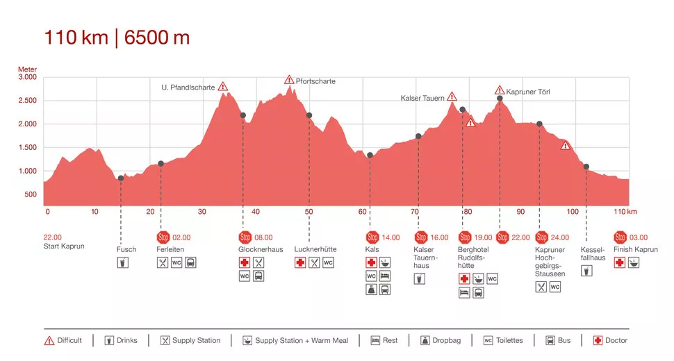 - trasa liniowa: start z Kals, dokąd zawodników przewożą autokary, meta w Kaprun. Trasa pokrywa się z drugą częścią GUT 110, obfituje w trudne technicznie fragmenty.