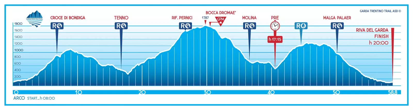 Trasa biegu prowadzi w większości po nawierzchni naturalnej (90%), jest liniowa i oferuje kilka widokowych punktów: uprawę oliwek w Arco, Treni, nad jeziorami Tenno i LEdro, Borgo Canale, zamek Tenno, Bocca Dromaè i malowniczą ścieżkę Ponale, która będzie ostatnim zbiegiem przed metą.