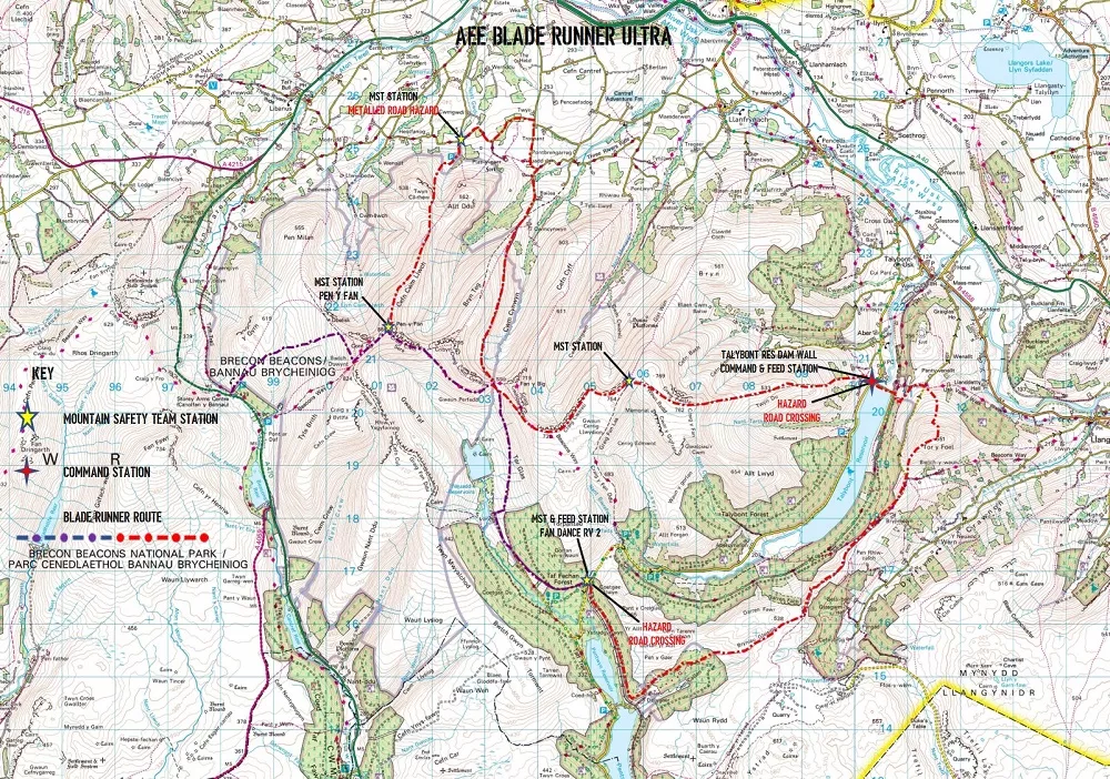 Trasa biegu to pętla długości 49,9 km. Rozpoczyna się i kończy w centrum aktywności i edukacji Storey Arms przy legendarnej budce telefonicznej, związanej także z selekcją SAS. Trasa Blade Runner przebiega po szlakach leśnych, ścieżkach górskich i starych rzymskich drogach. Przewyższenie wynosi 2130 m.
