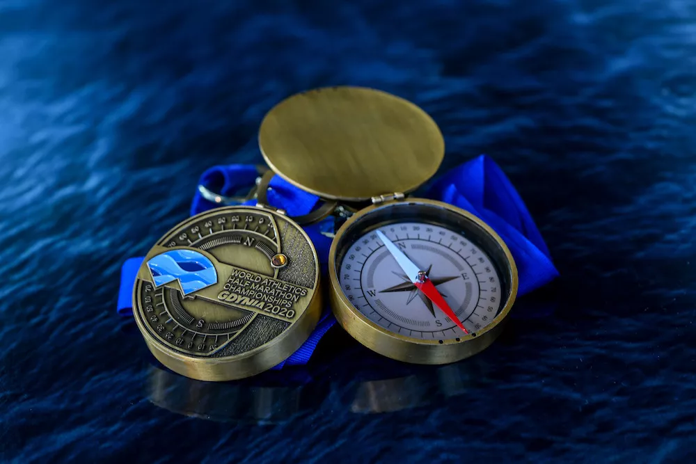 Medal finishera ma stanowić unikalną pamiątkę z ukończenia zawodów. Nie da się ukryć, że zaprezentowany dziś medal World Athletics Half Marathon Chamionships – Gdynia 2020 jest absolutnie wyjątkowy. Jest duży, został precyzyjnie zaprojektowany i wykonany na kształt kompasu. Na awersie widnieje kolorowe logo mistrzostw, a symbolicznym odniesieniem do lokalizacji wydarzenia jest ręcznie osadzona w medalu kropla bursztynu – skarbu Bałtyku. Rewers medalu zdobi kontur Polski z miejscem do wygrawerowania swojego nazwiska i wyniku, uzyskanego podczas biegu półmaratońskiego.