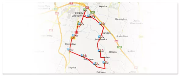 Pierwsze kilometry trasy ciągną się wzdłuż starej linii kolejowej, dzisiaj używanej tylko sporadycznie na potrzeby transportu towarowego, aż do granic wsi Bielany Wrocławskie. Następnie wybiegamy na drogę na Kłodzko, dosyć ruchliwą lecz na szczęście od momentu wybudowania Autostradowej Obwodnicy Wrocławia jeździ tędy dużo mniej pojazdów niż jeszcze kilka lat temu. Już na końcu kolejnej wsi, w Domasławiu, skręcamy w lewo w kierunku na wieś o pięknej nazwie Żórawina. Zaraz przed dotarciem do niej odbijamy w lewo w stronę Komorowa, mijamy właśnie 10km. Droga lekko kręta, przez to nie nudna doprowadzi nas do wiaduktu pod autostradą A4 z Wrocławia w kierunku na Katowice - 500m wcześniej skręcamy w polną drogę, pod górę aby po 1km dotrzeć do starej strzelnicy wojskowej. Biegniemy dalej pozdrawiając mieszkańców wsi Ślęza i dobiegamy z powrotem do Bielan Wrocławskich. Po minięciu przejazdy kolejowego skręcamy w prawo i przed nami już ostatnia prosta naszego 17km odcinka biegu.