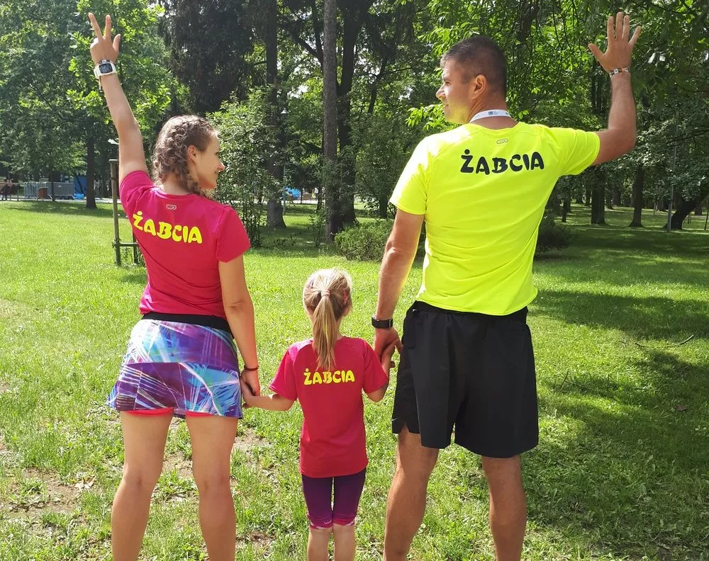 Biegające Żabcie to trzyosobowa rodzina z podwarszawskiego Konstancina-Jeziorny (plus jeszcze Babcia i od roku pies), która prawie 4 lata temu wprowadziła w swoje życie aktywność fizyczną. Marzena Parys, Łukasz Bednarczyk i ich córeczka Michalina.