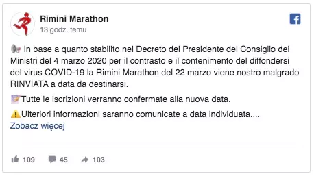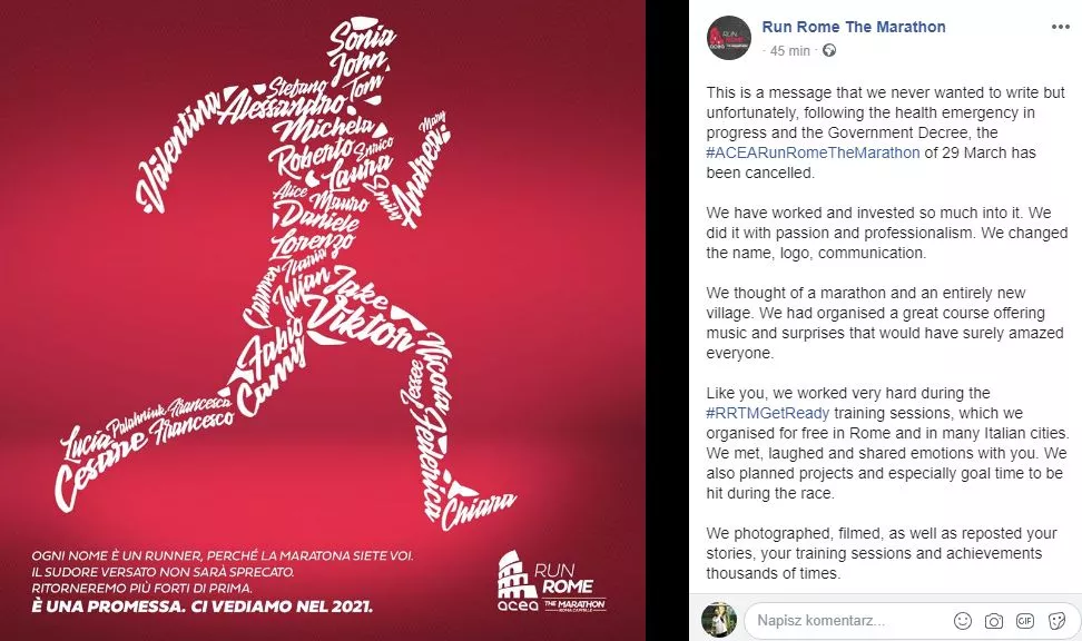 We Włoszech wydano dekret odwołujący imprezy masowe do 3 kwietnia. Oznacza to przełożenie kilku popularnych imprez w tym Maratonu Rzymskiego, który powinien odbyć się pod koniec marca. Organizatorzy biegu po południu wydali komunikat w tej sprawie. Przeprosili za wszelkie niedogodności, ale "zdrowie jest najważniejsze". Zapewnili, że zdwoją wysiłki, by impreza za rok była jak najlepsza. Jeśli chodzi o opłaty startowe, to stwierdzili, że wszystkie przechodzą na przyszły rok. Obiecali, że każdy, kto sie zapisał na tegoroczną edycję dostanie dwa medale, jeden jako symbol siły i uporu w dążeniu do sukcesu, a drugi jak symbol podwójnego zwycięstwa.