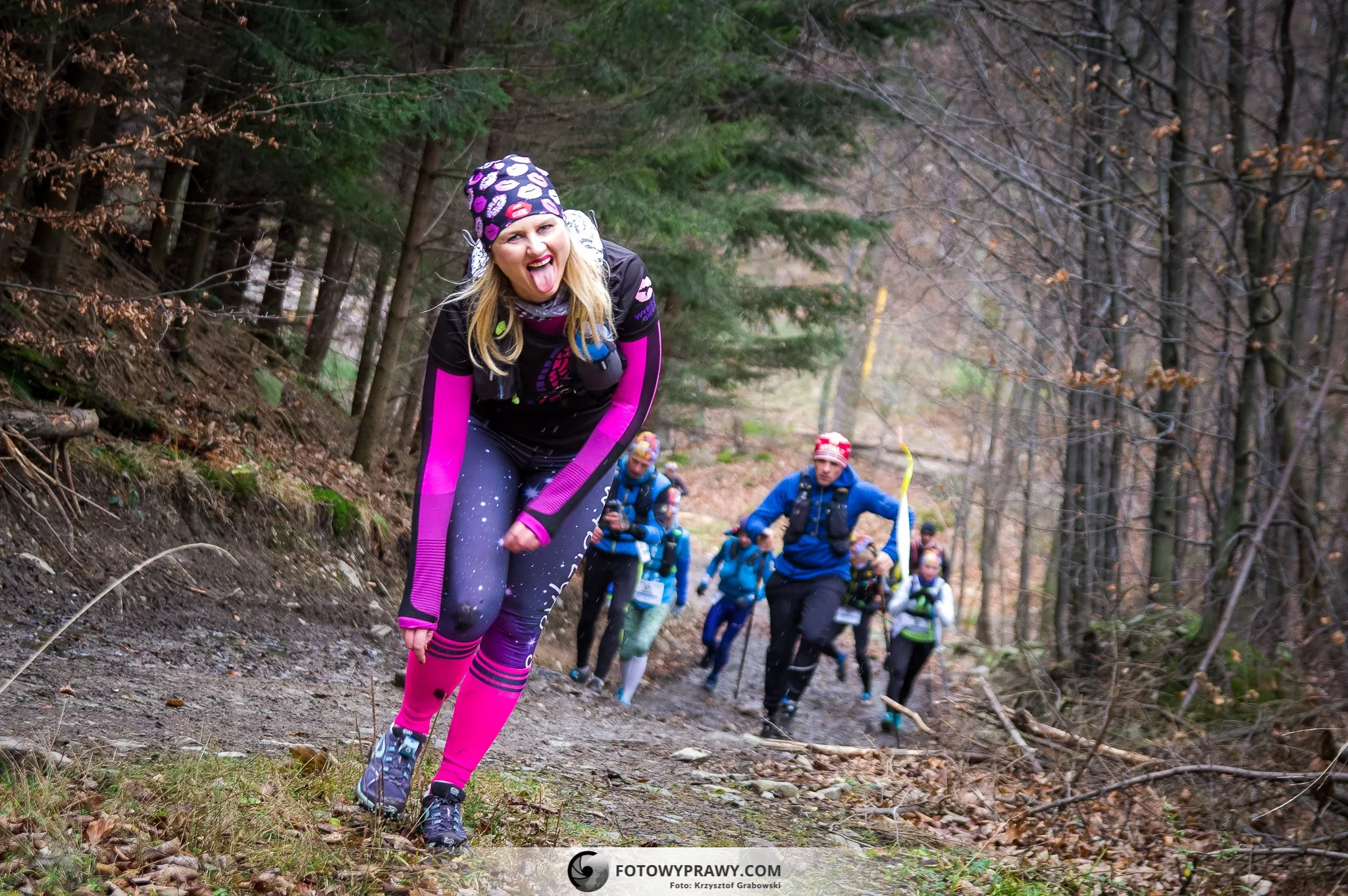 Dotarłam i nie omieszkałam podzielić się swoim brakiem subtelności i ordynarnym synonimem słowa idź stąd, z tymi, którzy raczyli sobie jeszcze żartować, że mnie za to zdyskwalifikują. Argument niebycia damą na biegach górskich i komplementowanie kurtki spisującego numery przyczynił się do perspektywy drugiej dyskwalifikacji. Ich poczucie humoru zasługuje na Emmy w kategorii komediowy serial biegowy. W horrorze też, by ją mogli śmiało dostać. Śmieszkowie wymyślili sobie, że po tym stromym zbiegu, na którego końcu czekali, by nas nakarmić i napoić, mamy kierować się w drugą stronę – oczywiście pod górę. I nie ma sensu patrzeć w górę, po co się denerwować. Jak jesteś już na płaskim, to kolejna szarfa powiewa na ścieżce, która znowu prowadzi, o dziwo, w górę.