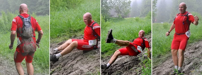 - Oj tak błoto było wszędzie. Dało się wszystkim we znaki. Buty grzęzły po kostki i zostawały. Jeszcze z podejściami nie było tak źle, jak ze zbiegami. To właśnie na jednym z nich zaliczyłem ten efektowny upadek. Proszę pozdrowić autorkę zdjęcia. Ciszę się, że w odpowiednim momencie nacisnęła spust migawki. Nic mi się nie stało, pozbierałem się i z uśmiechem na twarzy pobiegliśmy dalej.