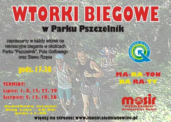 Miejski Ośrodek Sportu i Rekreacji "Pszczelnik" w Siemianowicach Śląskich po raz kolejny zaprasza miłośników biegania do udziału w wakacyjnej imprezie rekreacyjnej pod nazwą „Wtorki Biegowe - Maraton na Raty”. To zabawa biegowa polegająca każdorazowo na pokonaniu dystansu 5,5 km po pętli wokół Parku Pszczelnik, Pola Golfowego oraz Stawu Rzęsa.