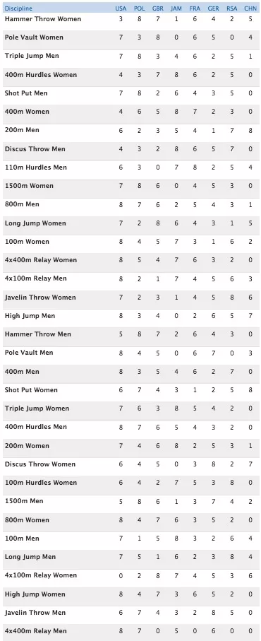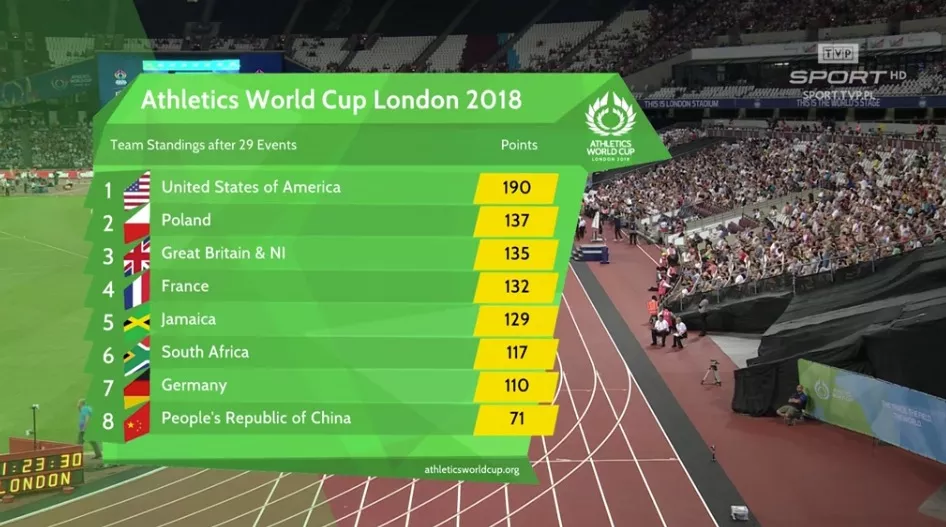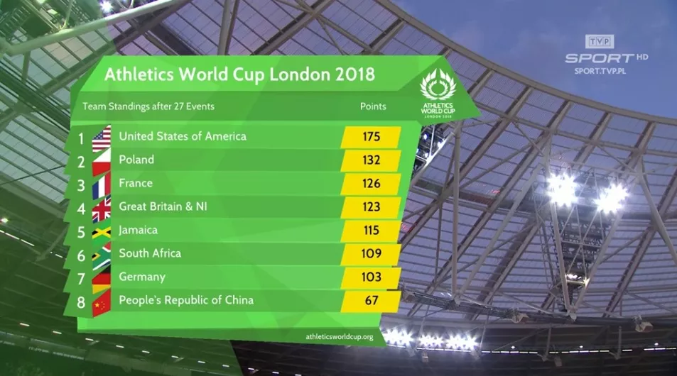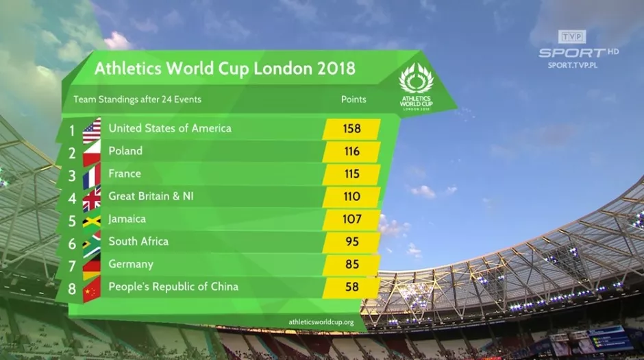 Czwarte miejsce Brytyjczyków, szóste Francuzów spowodowały zmniejszenie przewagi Biało-Czerwonych na drugim miejscu w tabeli Pucharu. Dodatkowo wygrana Jamajczyków nakazywała uważnie przyglądać się trwającym wciąż i pozostającym do rozegrania konkurencjom. Tabela wyraźnie się spłaszczyła.