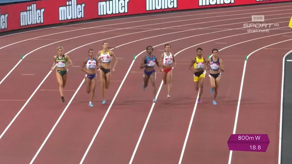 W biegu na 800 m, pod nieobecność Angeliki Cichockiej i Joanny Jóźwik, zobaczyliśmy Annę Sabat. Podopieczna Piotra Kowala z CWKS Resovia Rzeszów zaczęła spokojnie, od 7-8 pozycji. Tempo nadawały Francuska i Brytyjka, które desperacko szukały punktów dla swoich reprezentacji. Mocno zapłaciła za to ta pierwsza. Polka przyspieszyła na przeciwległej prostej, wyprzedziła słabnącą Francuzkę, ale po kolizji z Jamajką sił starczyło tylko na piąte miejsce (wynik 2:02.93). Kolejne cztery punkty zasiliły konto naszej reprezentacji.