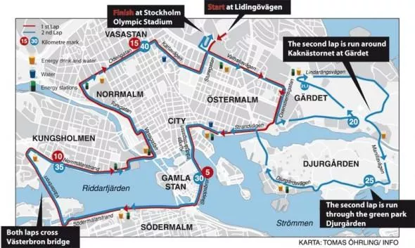 Trasa maratonu przebiega przez centrum Sztokholmu przez 5 wysp: Östermalm, Gamla Stan, Södermalm, Längholmen i Djurgärden oraz nabrzeżem kanałów Morza Bałtyckiego i brzegiem jeziora Mälaren. Biegnie przez najważniejsze ulice stolicy Szwecji, obok pałacu królewskiego, gmachu parlamentu, ratusza, dworca głównego. Meta umieszczona jest na stadionie olimpijskim z 1912 roku.