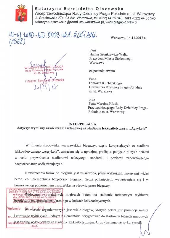 O podjęcie pilnych działań w celu przywrócenia stadionowi należytego standardu zwróciła się wiceprzewodnicząca rady Pragi Południe Katarzyna Bernadetta Olszewska. W swoim piśmie zaznaczyła, że nawierzchnia Agrykoli jest pełna wykruszeń i miejscami widać beton, co uniemożliwia bezpieczne bieganie. Trenowanie w takich warunkach Inicjatywa grozić przewróceniem się i uszczerbkiem na zdrowiu. Inicjatywa znalazła poparcie w Radzie Warszawy w osobie radnego Jarosława Szostakowskiego.