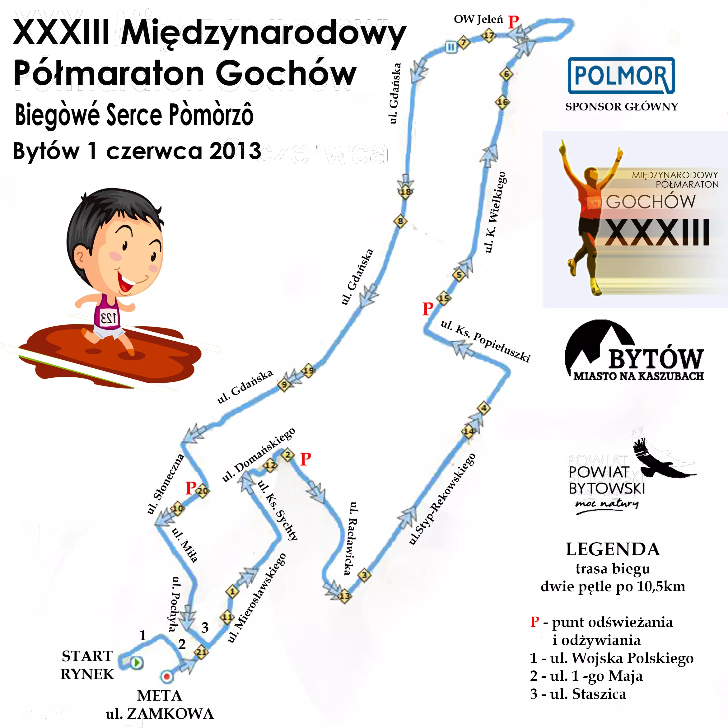 Wzorem minionych lat bieg będzie otwarty dla wszystkich miłośników aktywnego wypoczynku i biegowej rywalizacji. Podczas zawodów prowadzona będzie klasyfikacja generalna kobiet i mężczyzn, a także klasyfikacje wiekowe oraz na najlepszych mieszkańców miasta i gminy Bytów. Półmaratonowi po raz trzeci będzie towarzyszył marsz Nordic Walking na dystansie 10,5 km. Wszyscy zawodnicy, którzy ukończą zawody biegowe i marszowe otrzymają pamiątkowy medal lub statuetkę, a najlepsi z miejsc I-III nagrody finansowe i rzeczowe.