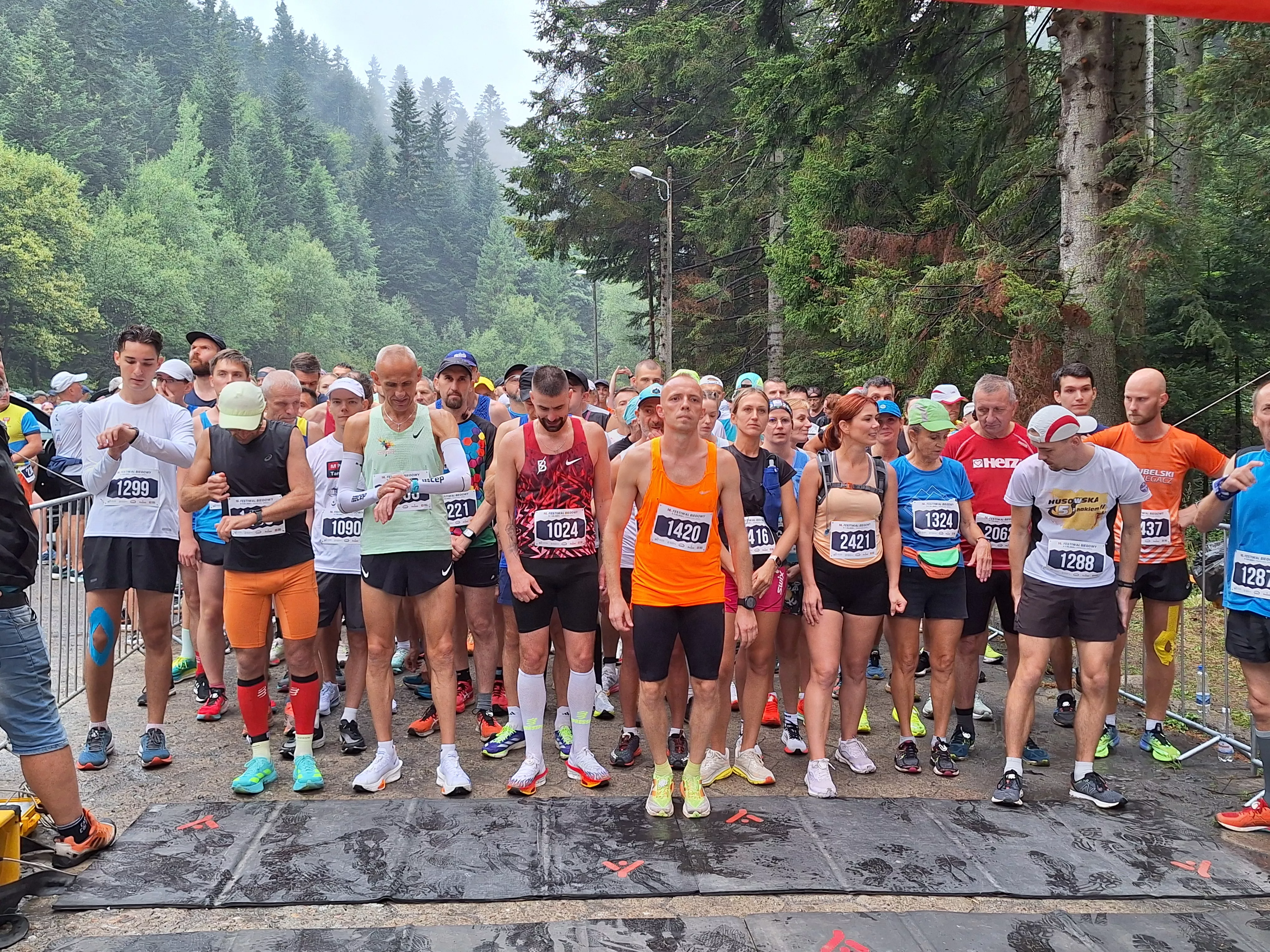 Punktualnie o godzinie 12 z Suchej Doliny w Kosarzyskach wystartowała Sądecka Dycha. Na starcie stawiła się rekordowa liczba zawodników, bo aż 450. Jedni cierpliwie oczekiwali na start biegu, inni robili w tym czasie rozgrzewkę. Mimo deszczowej pogody na twarzach wszystkich zawodników gościł uśmiech.