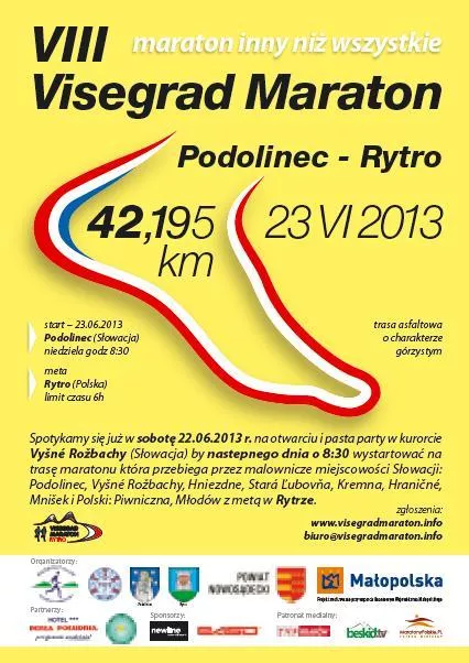 Maraton, odbywający się w tym roku w ramach Visegrad Sports Festival., wystartuje w niedzielę 23 czerwca o godz. 8:30 w Podolincu. Tradycyjna trasa poprowadzi biegaczy malowniczymi drogami i ulicami polsko-słowackiego pogranicza w okolice hotelu Perła Południa w Rytrze. Największym wyzwaniem dla biegaczy będzie ponad 5-kilometowy podbieg na przełęcz Vabec, tuż przed granicą Rzeczpospolitej. Obowiązuje limit trasy - 6 godzin.