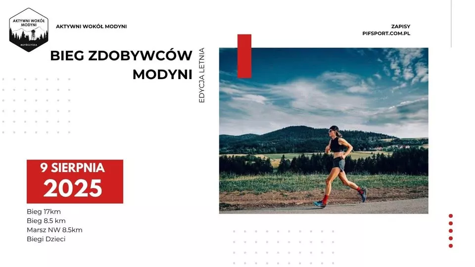 Stowarzyszenie Aktywni Wokół Modynii oraz Urząd Marszałkowski Województwa Małopolskiego serdecznie zapraszają na letnią edycję Biegu Zdobywców Modyni. Bieg odbędzie się 9 sierpnia w sobotę. Partnerami biegu są PIF SPORT Teresa Piwowar i Grupa GOPR, a patronat nad biegiem sprawują : Starostwo Powiatowe w Limanowej, Gmina Łukowica, Gmina Łącko, OSP Młyńczyka oraz GOSiT
