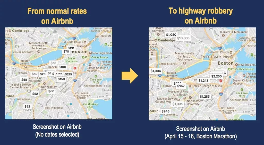 Statystyka dotyczy popularnego serwisu Airbnb. Internauci bacznie przyglądający się ofercie serwisu, skupieni wokół portalu www.airbnbwatch.org, przygotowali obszerny raport pokazujący jak mieszkańcy Bostonu i sam serwis wykorzystują tamtejszy maraton w zwiększaniu przychodów z najmu domów i mieszkań.