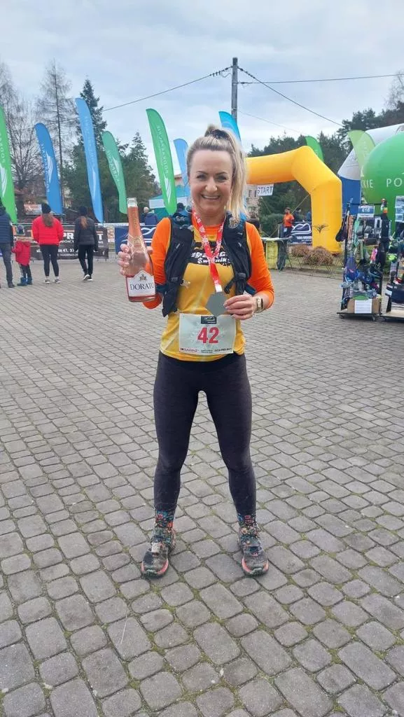 Dystans 43 km po wymagającej, trochę błotnistej i pagórkowatej ale bardzo urokliwej trasie pokonałam w czasie 4:06:19 co zapewniło mi 1️ miejsce wśród Pań