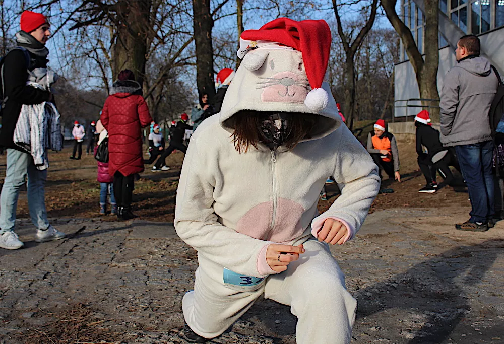 – To jest kotko-myszko-króliczek, czyli bardzo świąteczne zwierzątko, bo wszystkie istotki celebrują święta. Ten strój już testowałam podczas Półmaratonu Warszawskiego (2:37:33) i bardzo dobrze się sprawuje, a do tego cieszy innych, zwłaszcza młodszych kibiców. Może więc i teraz czyiś uśmiecham przywołałam! – opowiadała pani Katarzyna Hyra, która przyozdobiła swój strój w maskę antysmogową. – Sprawdziłam rano stan powietrza i nie jest najlepsze. Lepiej nie ryzykować… – wskazała.