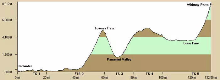 Uczestnicy oprócz walki z olbrzymim dystansem i ponad 50 stopniami Celsjusza w pełnym słońcu, biegną po rozgrzanym do niemal 90 stopni asfalcie równocześnie wspinając się z poziomu największej depresji Ameryki Północnej (-85 m poniżej poziomu morza), aż na wysokość podnóża (2533 m n.p.m) największego szczytu w Stanach Zjednoczonych - Mount Withney (4421 m n.p.m.). Podbiegi jakie mają do pokonania na trasie, sumarycznie tworzą, bagatela, 4450 metrów przewyższenia w pionie.
