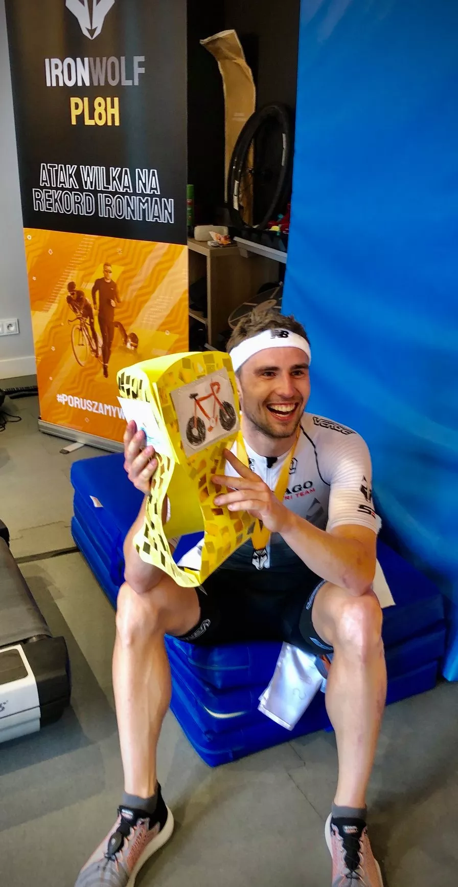 Oczywiście wynik mistrza Polski w triathlonie nie zostanie uznany, bo próba miała bardziej charakter oryginalnego wyzwania i zabawy - 3,8-kilometrowy odcinek pływacki „Wilku” pokonał w basenie z przeciwprądem, 180 km trasy kolarskiej przejechał na rowerze z aplikacją Zwift, by tej samej aplikacji użyć potem do rejestracji maratonu na bieżni elektrycznej.