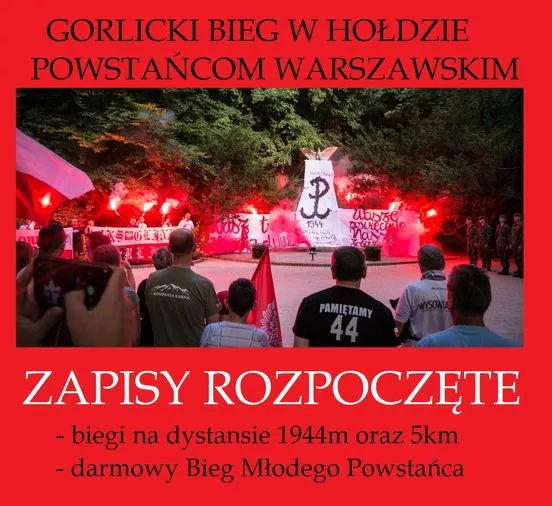 Pierwszego sierpnia w niedzielę został zaplanowany „II Gorlicki Bieg dla Powstańców Warszawskich”, który odbędzie w Parku Miejskim w Gorlicach. W programie zawodów będzie rywalizacja na 5 km oraz wielopokoleniowy marszobieg na 1944 m. Dla najmłodszych organizatorzy przewidują „Bieg Młodego Powstańca”.