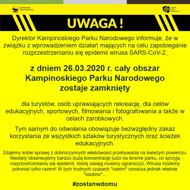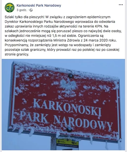 „W związku z zagrożeniem epidemicznym Dyrektor Karkonoskiego Parku Narodowego wprowadza do odwołania na terenie KPN zakaz uprawiania innych rodzajów aktywności niż wędrówki piesze. Na szlakach jednocześnie mogą się poruszać pieszo co najwyżej dwie osoby, w odległości nie mniejszej niż 1,5 m od siebie. Ograniczenia są konsekwencją rozporządzenia Ministra Zdrowia z 24 marca 2020 roku”