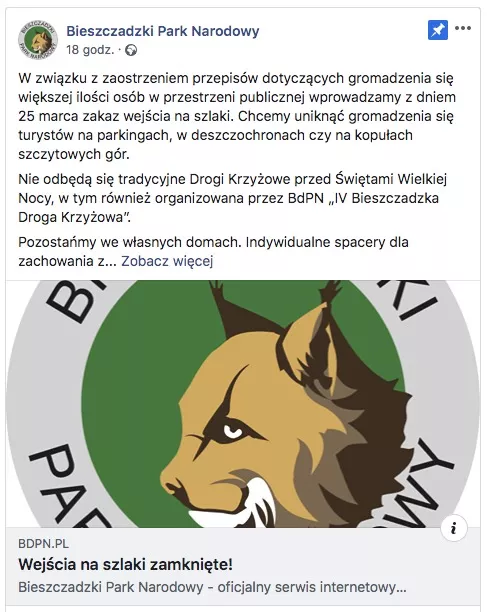 Od środy 25 marca obowiązuje również zakaz wejścia na szlaki Bieszczadzkiego Parku Narodowego.