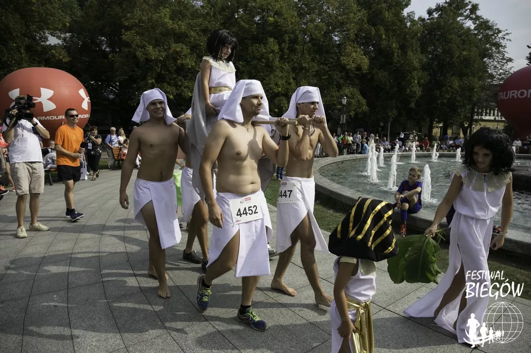 Bieg Przebierańców to konkurencja absolutnie wyjątkowa i nic dziwnego, że cieszy się ogromną popularnością wśród zawodników i jeszcze większą wśród kibiców. Jest na co popatrzeć! Tutaj także startować można indywidualnie lub drużynowo. Jednak w tej drugiej opcji zamiast trenować przekazywanie sztafetowej pałeczki, należy wymyślić przebrania, które stworzą całość. W ubiegłym roku bezkonkurencyjni w tej kategorii okazali się Egipcjanie, którzy w kusych przepaskach na biodrach nosili po krynickim deptaku Kleopatrę w lektyce. Nie był to jedyny najazd Egipcjan na Festiwal Biegowy, bowiem pojawili się już rok wcześniej, ale wtedy przywieźli ze sobą sporą piramidę i małą armię mumii.