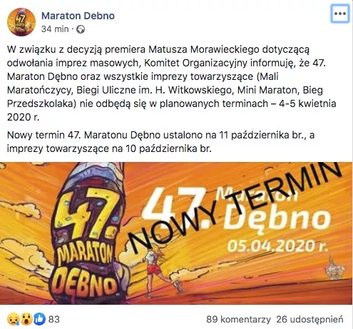 „W związku z decyzją premiera Matusza Morawieckiego dotyczącą odwołania imprez masowych, Komitet Organizacyjny informuję, że 47. Maraton Dębno oraz wszystkie imprezy towarzyszące (Mali Maratończycy, Biegi Uliczne im. H. Witkowskiego, Mini Maraton, Bieg Przedszkolaka) nie odbędą się w planowanych terminach – 4-5 kwietnia 2020 r.” – poinformowali organizatorzy.