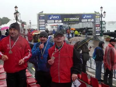 W niedzielę udajemy się, czterech biegaczy, na start. Najpierw do autobusów, które przewożą nas z Mestre do Stra. I tu, w szatniach było tłoczno, bo każdy do ostatniej chwili chciał schronić się przed zimnem. Po koszulkę ambasadora musiałem ubrać bluzę z długim rękawem. Każdy zawodnik wg swych dotychczasowych osiągnięć trafia do odpowiedniego sektora startowego, więc zostaliśmy rozdzieleni. Wśród wszystkich zgromadzonych ponad 7500 biegaczy, nastroje były nie najlepsze, bo tuż przed strzałem startera zaczęło padać, wiać i było coraz zimniej. W tych warunkach nie marzyłem już o „życiówce”, obecnie biegam około 4h. Po starcie, w miarę spokojnie trzymałem się baloników 3:50, po kilkunastu kilometrach biegłem nawet szybciej. W strugach deszczu i przy ostrym wietrze trzeba było przytrzymywać czapeczkę, by nie spadła z głowy. Najtrudniej było na 35 km, na moście Della Liberta, z powodu bardzo silnego wiatru. Po minięciu mostu już było łatwo, spokojnie do mety, choć po drodze był jeszcze kołyszący się most pontonowy. Mój wynik to brutto 4:04:53, bardzo zadowalający w tak trudnych warunkach. Pozostali koledzy M50: Marian Ryżak 3:29:19, Ryszard Fiega (również Ambasador Festiwalu Biegowego) 3:44:49, Józef Urbański 4:20:00.