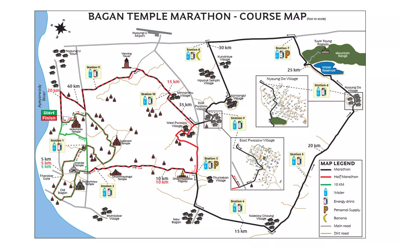 Start i metę ulokowano przy Htilominlo Temple, świątyni wybudowanej w 1211 roku. Trasa wiedzie polnymi, pylistymi drogami w stronę Starego Bagan. Po drodze mijamy świątyni, pagody i klasztory a organizatorzy zapewniają widoki zapierające dech w piersiach. Na przykład punkt z wodą na 11 km mieści się u podnóża pagody Dhammayazika – charakterystycznej buddyjskiej świątyni ze złotą kopułą, która liczy sobie 900 lat. W tym miejscu rozdzielają się trasy maratonu i półmaratonu, uczestnicy krótszego biegu kierują się w stronę mety. Maratończycy biegną do wioski Nyaungdo i dalej do Pwazaw a stamtąd do świątyni Htilominlo, przy której mieści się meta. Większą część trasy stanowią drogi polne, ale kilka odcinków wiedzie asfaltem.