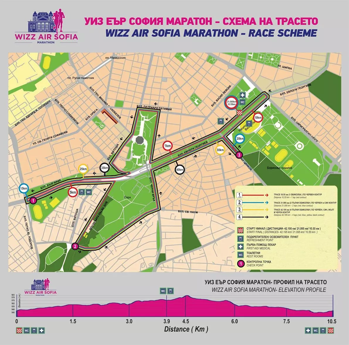 Trasę maratonu poprowadzono w samym sercu stolicy Bułgarii. Niestety, mierzy ona tylko 10,55 km, co oznacza, że maratończycy muszą pokonać ją cztery razy. Równolegle odbywa się półmaraton na dwóch pętlach i bieg na dystansie ćwierćmaratonu. Start ulokowano przy Stadionie Narodowym Wasyla Lewskiego.