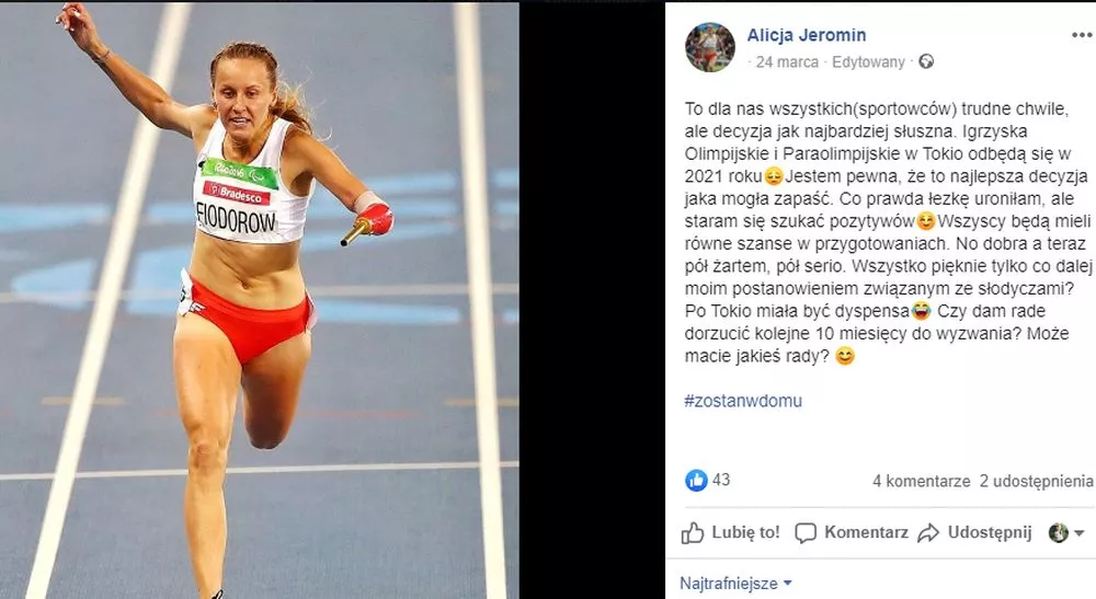 „To dla nas wszystkich (sportowców) trudne chwile, ale decyzja jak najbardziej słuszna. Igrzyska Olimpijskie i Paraolimpijskie w Tokio odbędą się w 2021 roku. Jestem pewna, że to najlepsza decyzja, jaka mogła zapaść. Co prawda łezkę uroniłam, ale staram się szukać pozytywów. Wszyscy będą mieli równe szanse w przygotowaniach. No dobra, a teraz pół żartem, pół serio. Wszystko pięknie tylko co dalej z moim postanowieniem związanym ze słodyczami? Po Tokio miała być dyspensa. Czy dam radę dorzucić kolejne 10 miesięcy do wyzwania? Może macie jakieś rady?”- pytała na swoim profilu faworytka biegu na 100 i 200 m Alicja Jeromin, która jakiś czas temu rozpoczęła projekt „ Bez słodyczy do Tokio”.