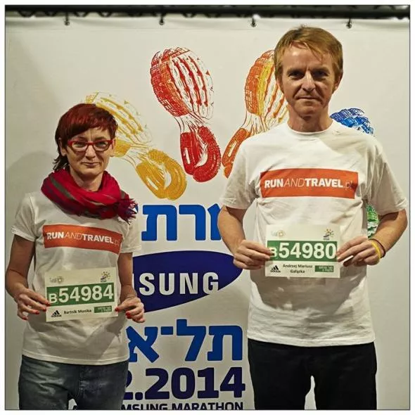 A co w pakiecie startowym? Numer startowy z chipem, koszulka techniczna Adidasa i materiały promocyjne od sponsorów i partnerów imprezy. Z żalem stwierdzamy, że nieznajomość języka szkodzi, bo chyba ominęło nas kilka zniżek w izraelskich sklepach. Jedyne bowiem, co zrozumieliśmy to cyferki. Ale już, co, kto, do kiedy i dlaczego było poza naszym zasięgiem. Jakoś jednak specjalnie nas to nie zmartwiło. Po odbiorze pakietów obowiązkowe zdjęcie z numerem startowym na ściance i próba zrozumienia graficznego zestawienia najciekawszych faktów na temat imprezy. Dobrze, że był tłumacz.