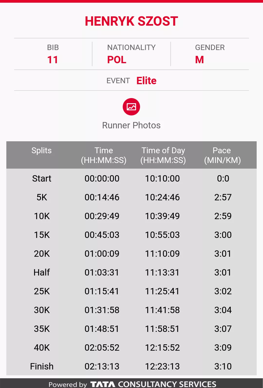 Henryk Szost na półmetku zameldował się z czasem 1:03:31. Niestety drugą część dystansu pokonywał ponad 6 minut dłużej. Ukończył bieg na 18. miejscu, z czasem 2:13:13.