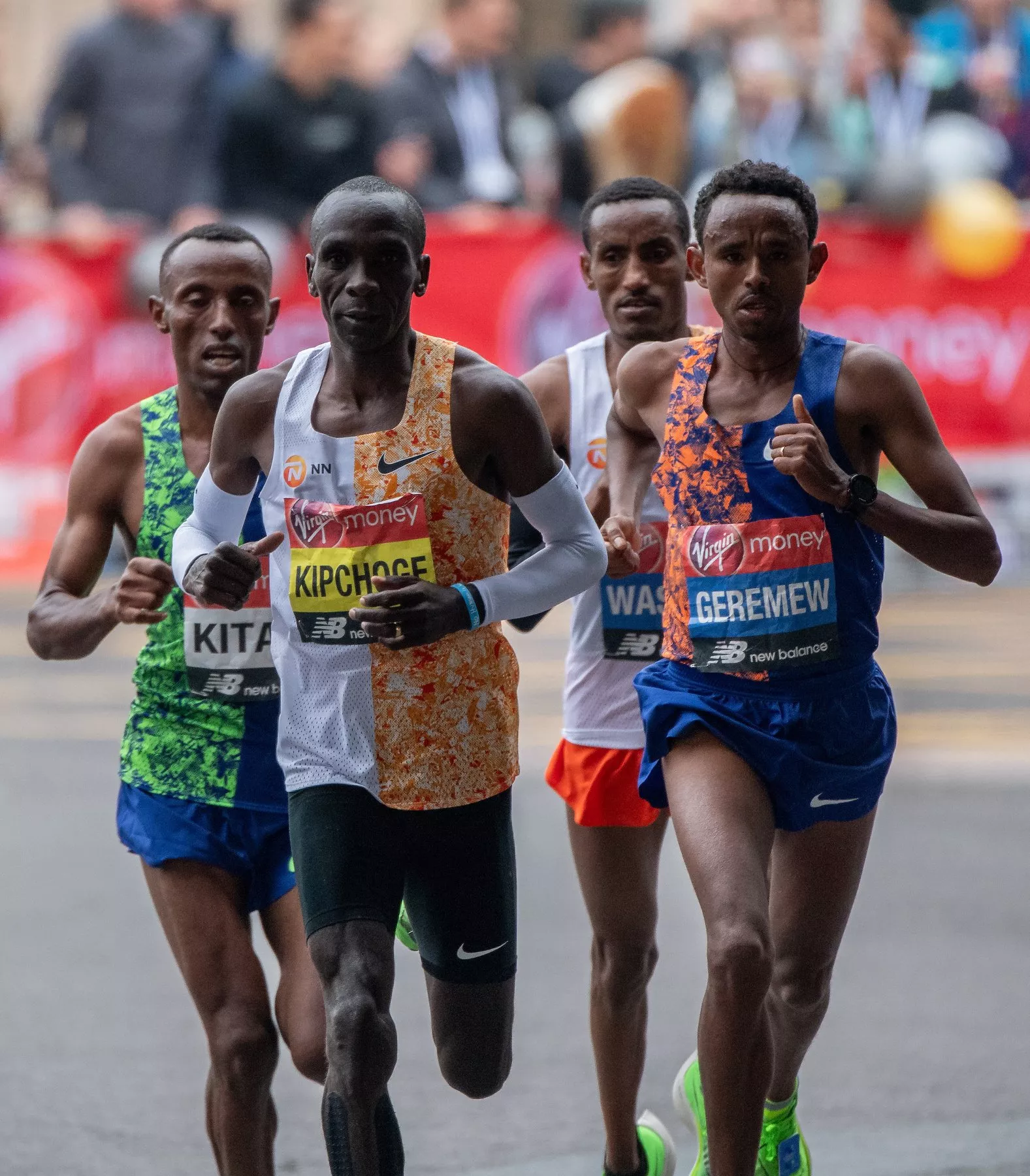 Od Kipchoge i Etiopczyka Mosineta Geremewa, który jako jedyny był w stanie utrzymać tempo obrońcy tytułu, zaczął odstawać inny z Kenijczyków Shura Kitata. Na trzecią pozycję przesunął się Mule Wasihun. I taka kolejność utrzymała się do mety.