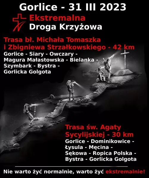 Ekstremalna Droga Krzyżowa jest pomysłem księdza Jacka Wiosny Stryczka i odbywa się od 2009 roku, a do Gorlic oficjalnie zawitała 18 marca 2016 roku. Gorlicki sztab Ekstremalnej Drogi Krzyżowej proponuje w tym roku dwie trasy o różnym stopniu trudności.